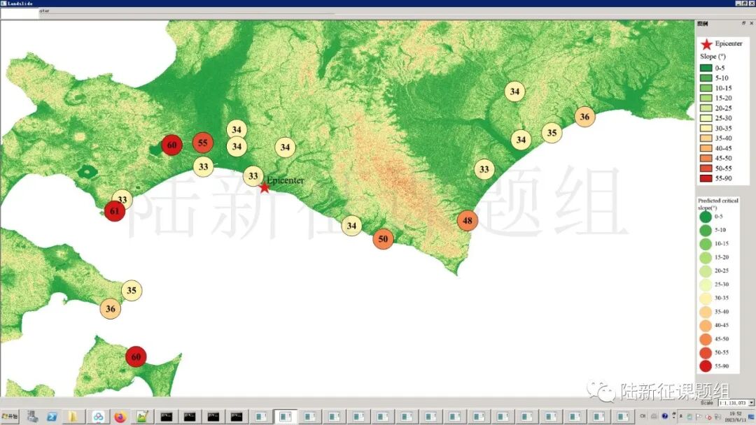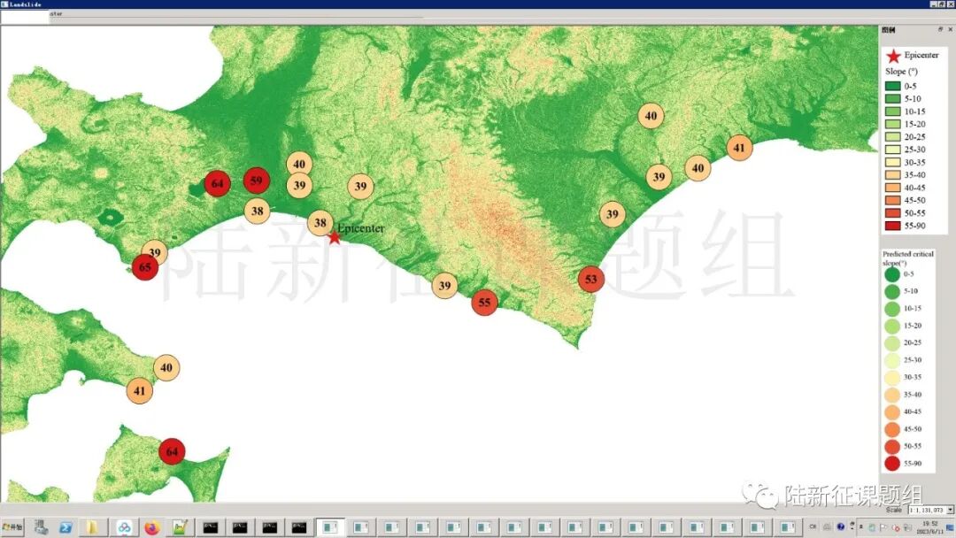 根据当地地形数据、岩性数据和实测地面运动记录,可以计算得到不同滑坡体饱和比例下的滑坡分布,如图5所示。其中,底图为当地坡度分布图,每个圆圈代表每个台站的计算结果,圆圈中的数字代表发生滑坡的临界坡度,台站附近坡度大于该数值的地方滑坡发生概率高。