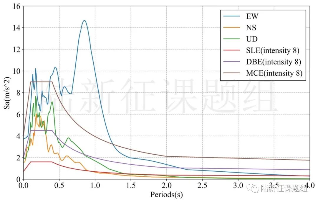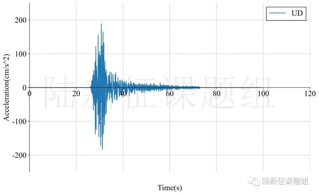 SC.T2601典型台站位置北纬30.38度,东经103.01度,记录到水平向地震动峰值加速度为377cm/s/s,竖直向地震动峰值加速度为189cm/s/s。该地震动及反应谱如图1、图2所示。另外SC.T2671记录到1282cm/s/s的加速度,但是中长周期反应谱强度不及SC.T2601。