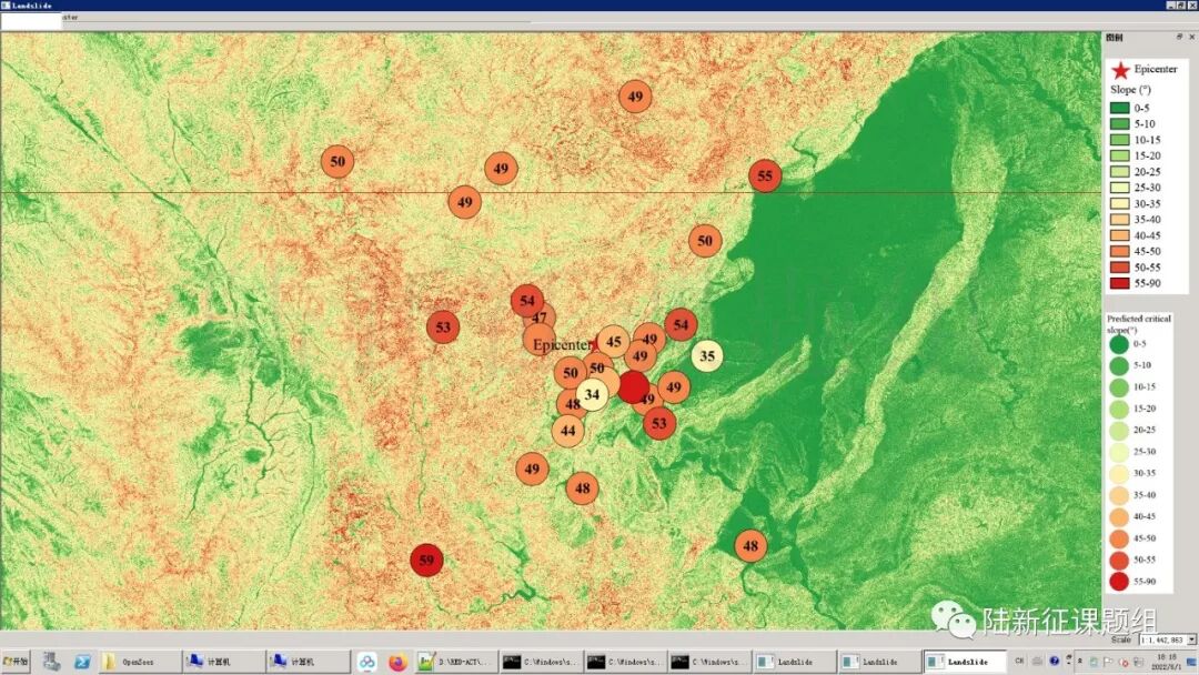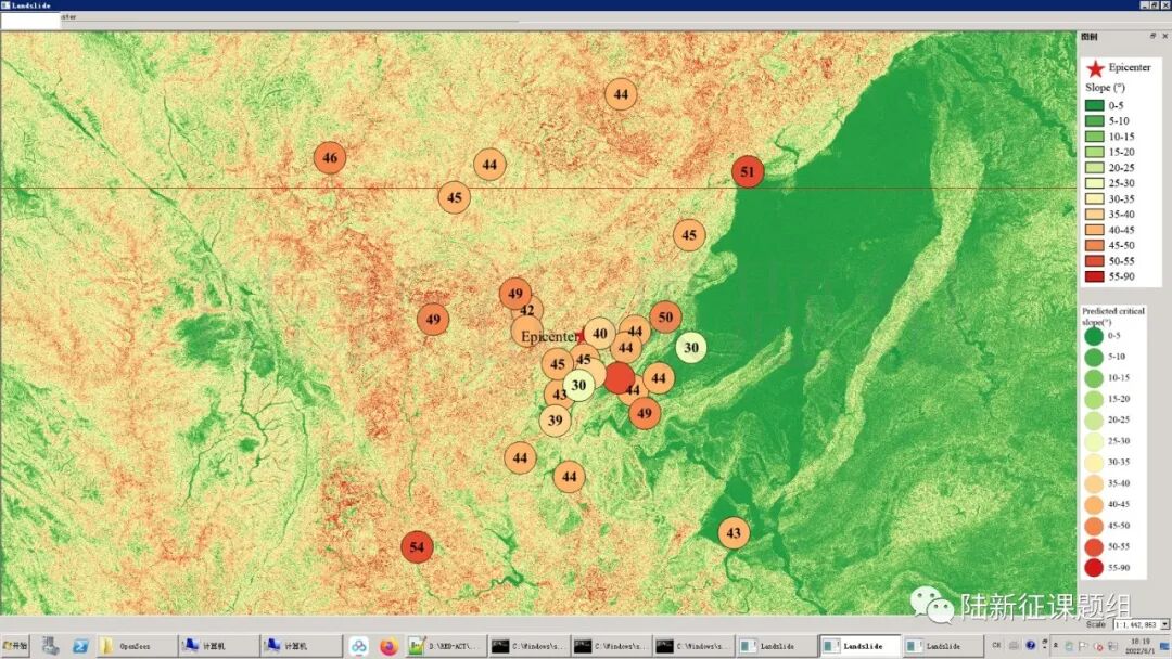 根据当地地形数据、岩性数据和实测地面运动记录,可以计算得到不同滑坡体饱和比例下的滑坡分布,如图5所示。其中,底图为当地坡度分布图,每个圆圈代表每个台站的计算结果,圆圈中的数字代表发生滑坡的临界坡度,台站附近坡度大于该数值的地方滑坡发生概率高。