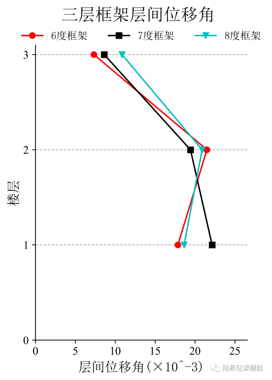 将典型台站记录输入立面布置如图6(a)所示的6度、7度和8度设防的典型三层钢筋混凝土框架结构,得到其层间位移角包络如图6(b)所示。