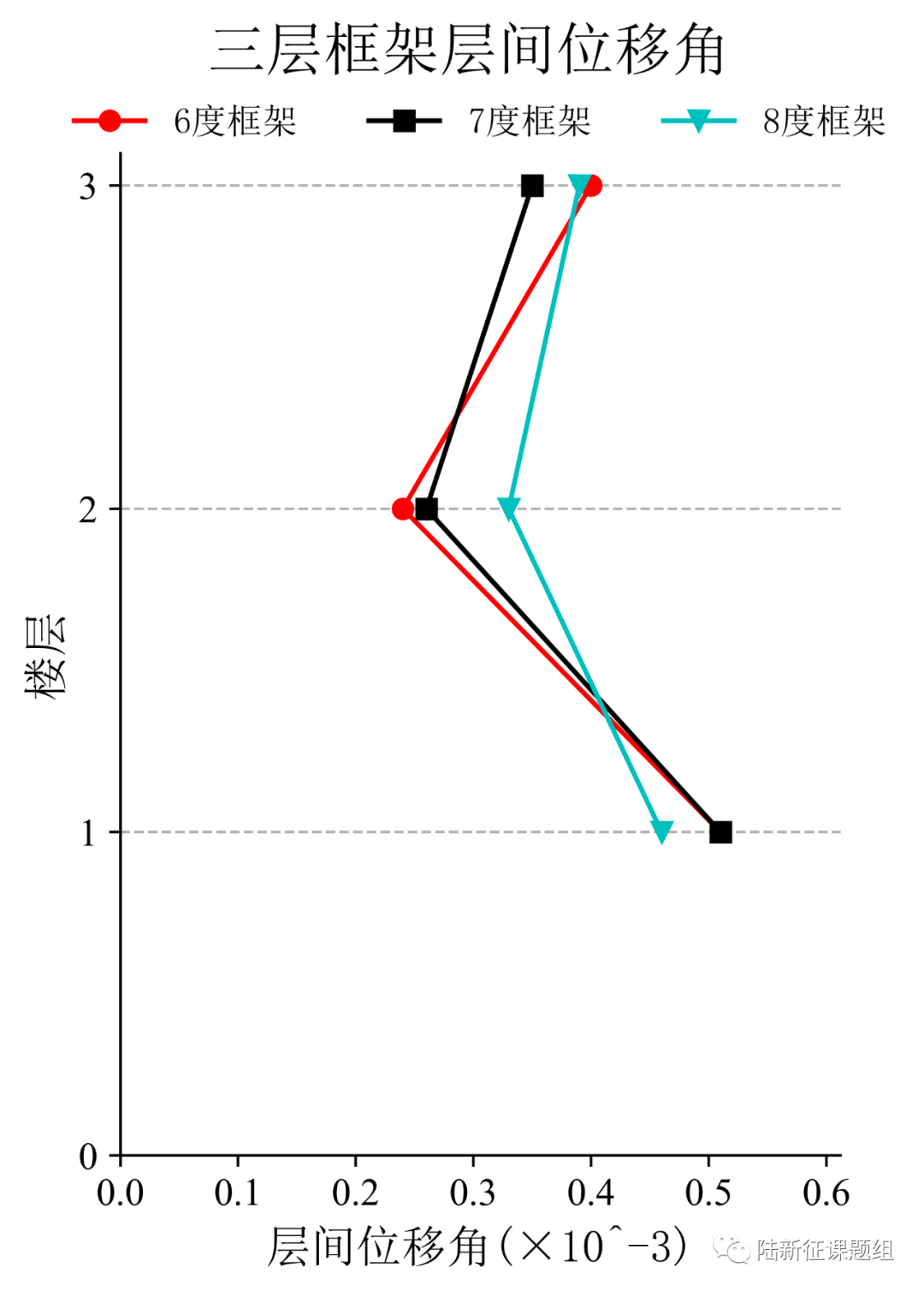 将典型台站记录输入立面布置如图6(a)所示的6度、7度和8度设防的典型三层钢筋混凝土框架结构,得到其层间位移角包络如图6(b)所示。