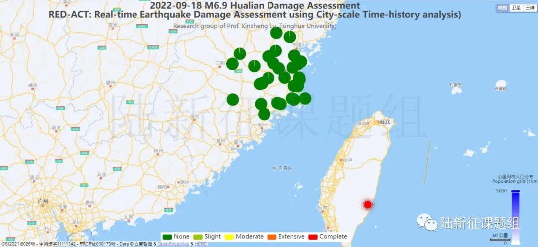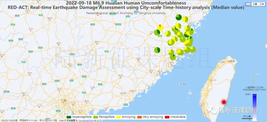 根据中国地震学会标准《基于强震动记录的地震破坏力评估T/SSC 1—2021》(参阅新标准发布 :基于强震动记录的地震破坏力评估),利用密布强震台网在震后获取的实时地震动信息,再结合城市抗震弹塑性分析,就可以得到地震发生后不同地点的建筑破坏情况,为抗震救灾决策提供科学支撑。图3为根据本次地震中国地震台网中心台站记录分析得到的建筑震害分布示意图。图4为根据本次地震中国地震台网中心台站记录分析得到的人员加速度感受分布示意图。需要说明的是,由于台湾岛内详细地震动数据未能获得,所以无法进行分析。