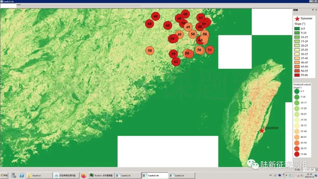 根据当地地形数据、岩性数据和实测地面运动记录,可以计算得到不同滑坡体饱和比例下的滑坡分布,如图5所示。其中,底图为当地坡度分布图,每个圆圈代表每个台站的计算结果,圆圈中的数字代表发生滑坡的临界坡度,台站附近坡度大于该数值的地方滑坡发生概率高。
