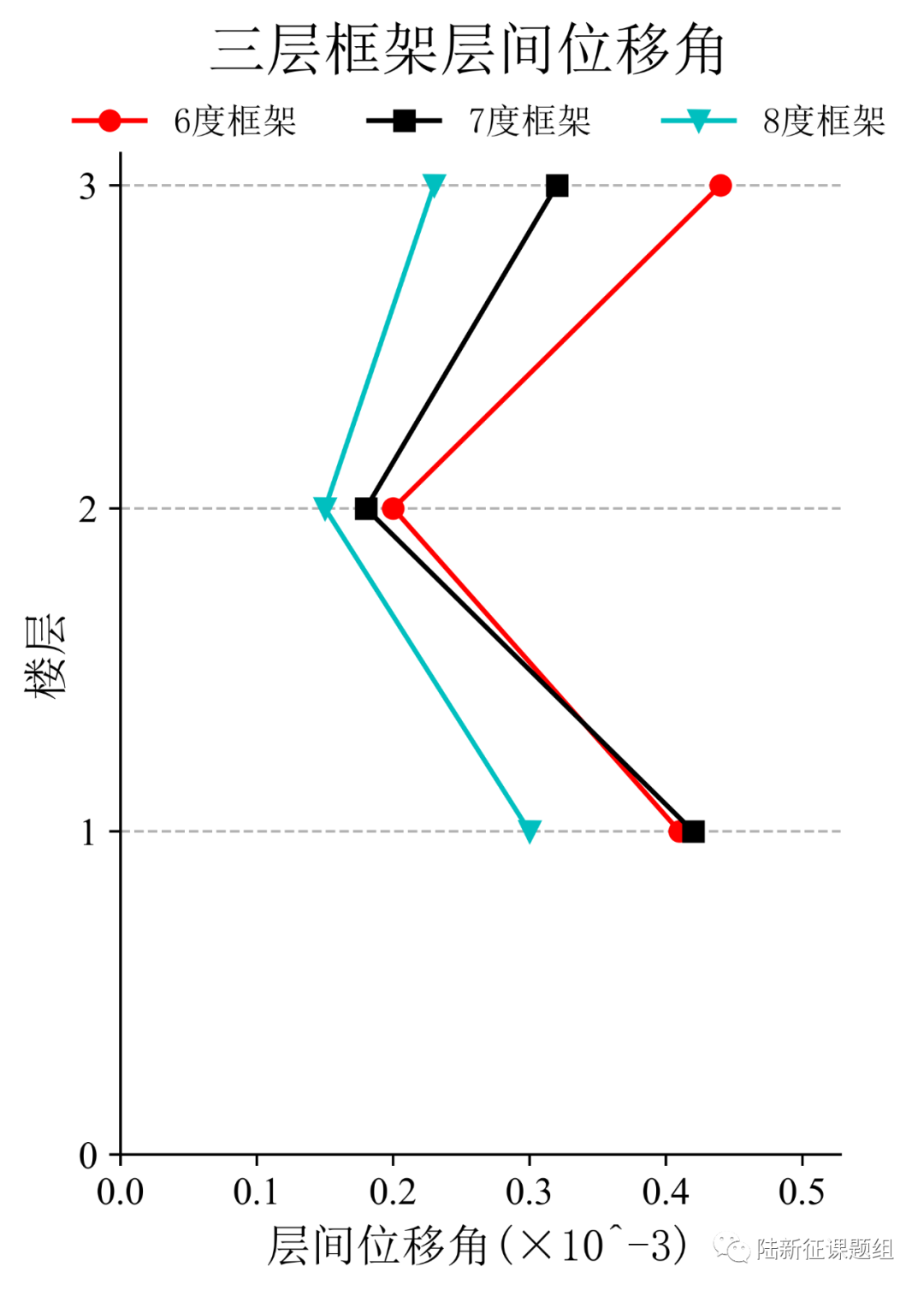将FJ.H0011典型台站记录输入立面布置如图6(a)所示的6度、7度和8度设防的典型三层钢筋混凝土框架结构,得到其层间位移角包络如图6(b)所示。