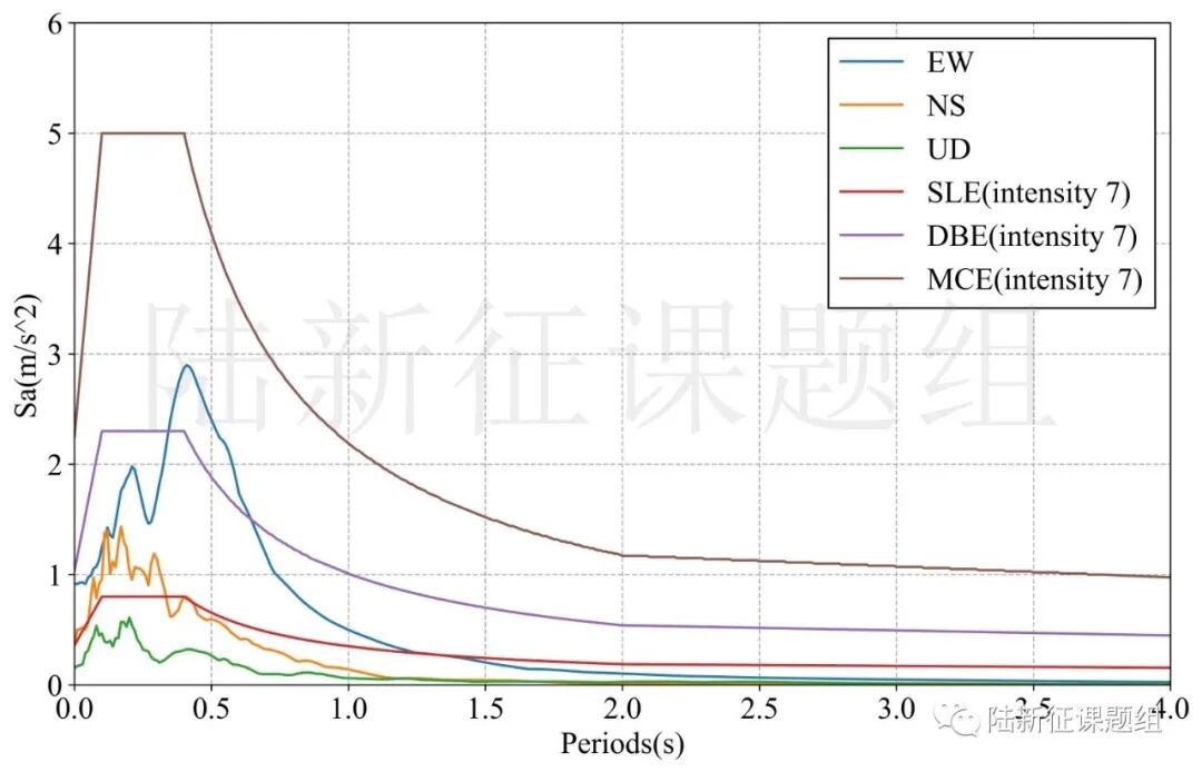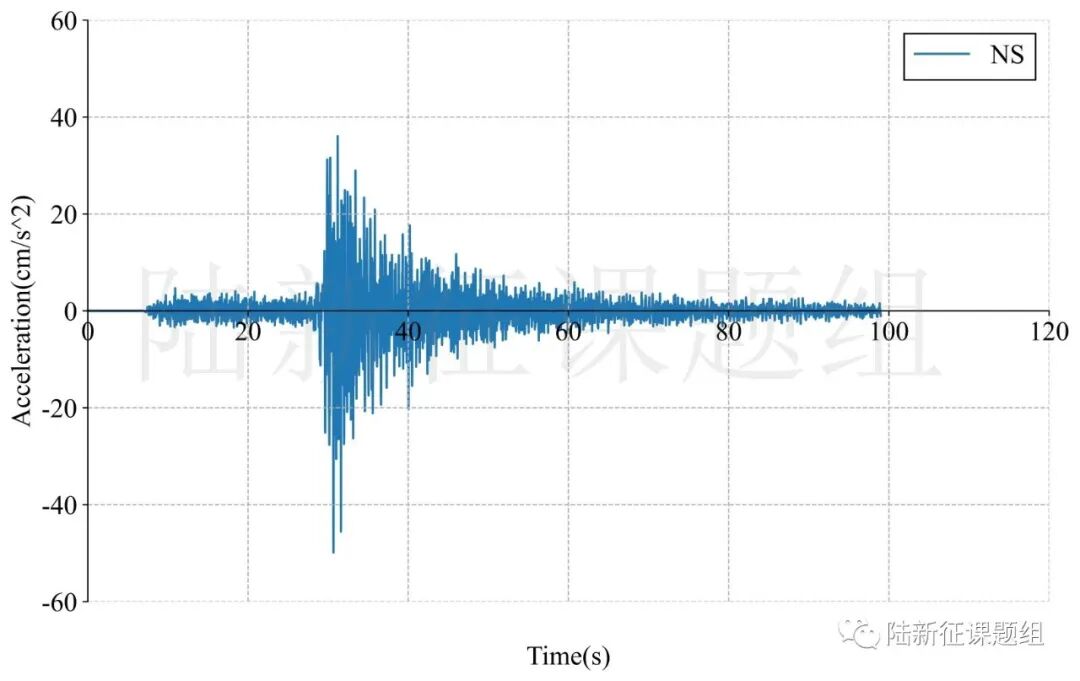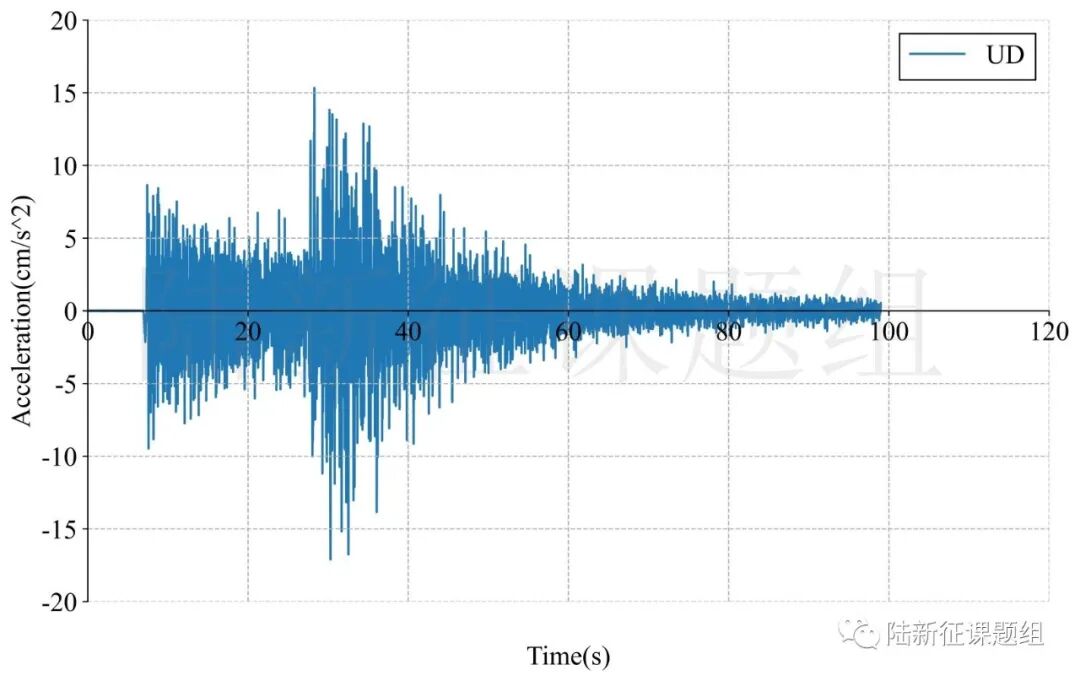 XJ.NK005典型台站位置北纬41.17度,东经83.59度,记录到水平向地震动峰值加速度为91.4cm/s/s,竖直向地震动峰值加速度为17.1cm/s/s。该地震动及反应谱如图1、图2所示。