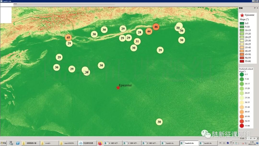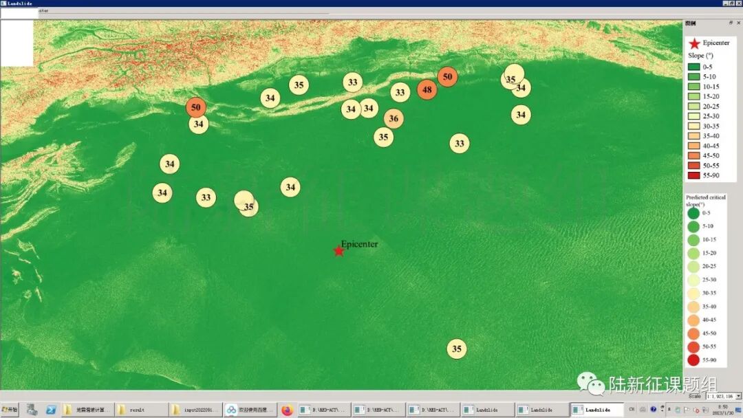 根据当地地形数据、岩性数据和实测地面运动记录,可以计算得到不同滑坡体饱和比例下的滑坡分布,如图5所示。其中,底图为当地坡度分布图,每个圆圈代表每个台站的计算结果,圆圈中的数字代表发生滑坡的临界坡度,台站附近坡度大于该数值的地方滑坡发生概率高。