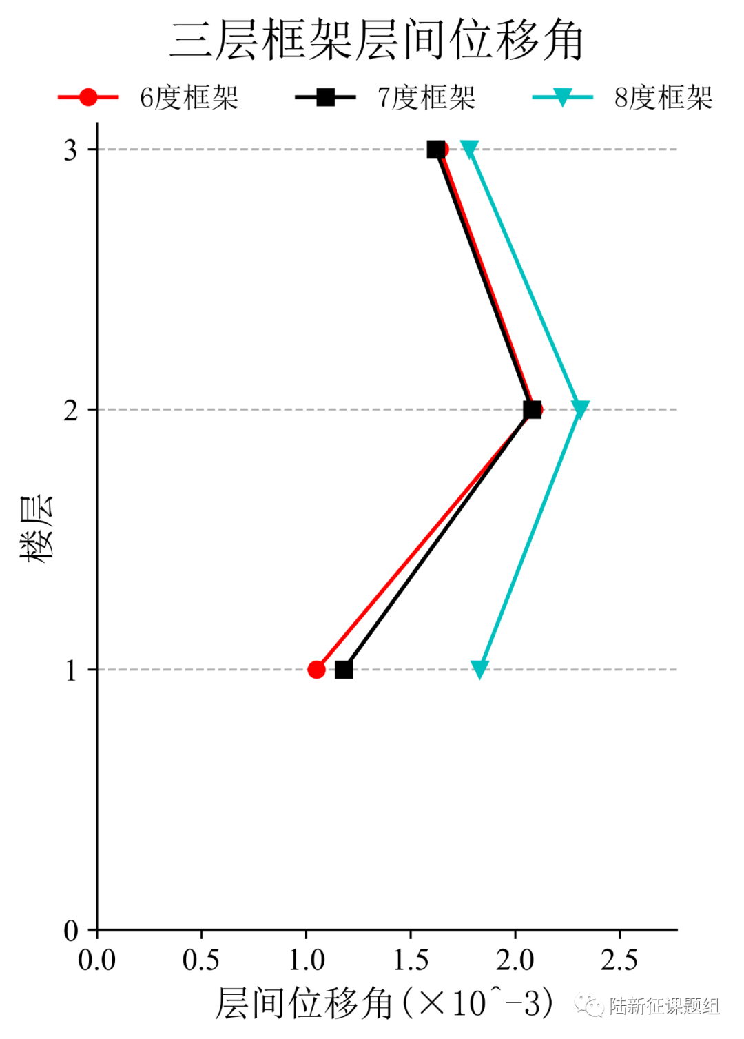 将典型台站记录输入立面布置如图6(a)所示的6度、7度和8度设防的典型三层钢筋混凝土框架结构,得到其层间位移角包络如图6(b)所示。