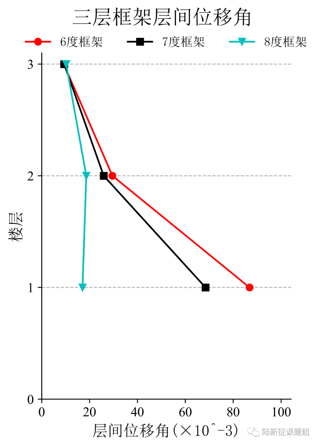 将典型台站记录输入立面布置如图6(a)所示的6度、7度和8度设防的典型三层钢筋混凝土框架结构,得到其层间位移角包络如图6(b)所示。