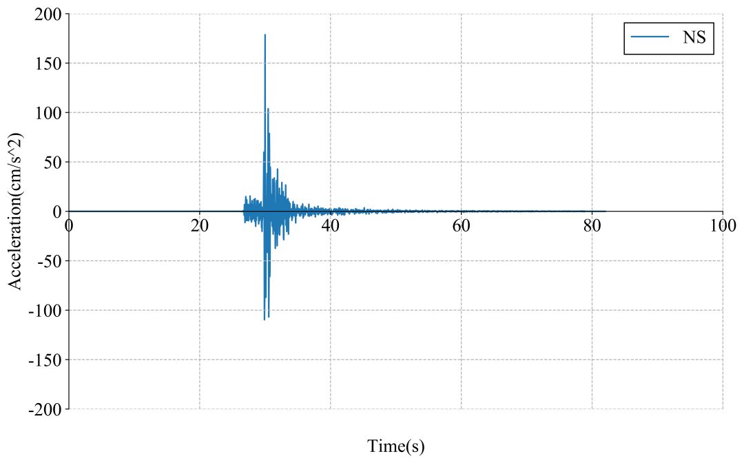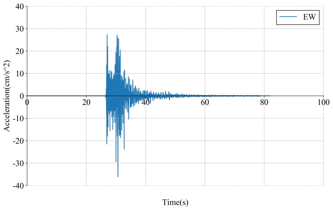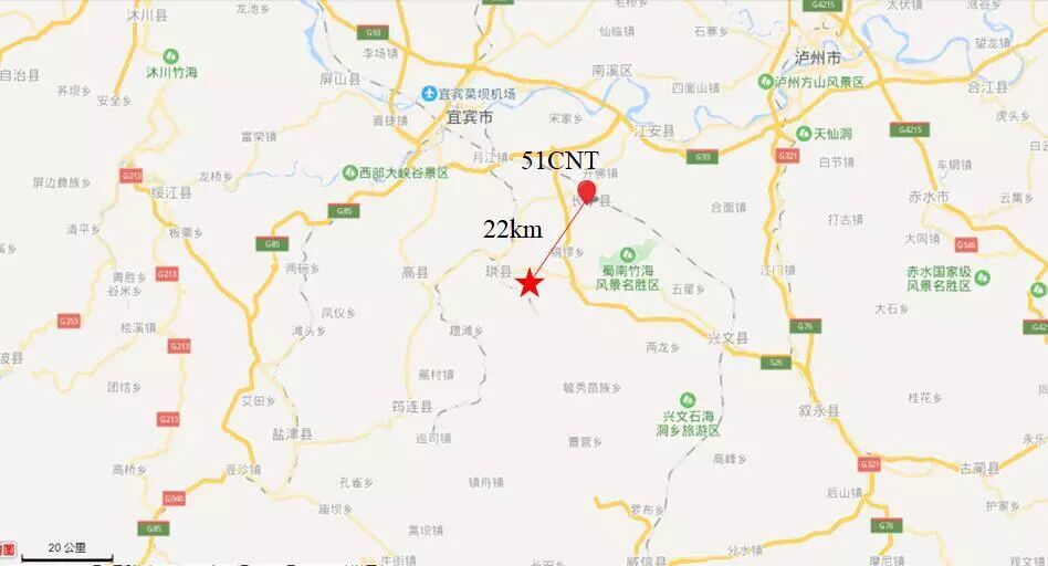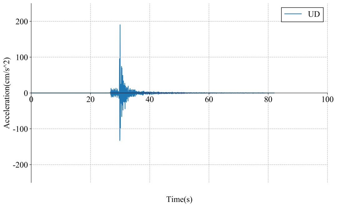 51CNT记录台站位置北纬28.58度,东经104.92度(图1,其中红色五角星为震中位置),记录到水平向地震动峰值加速度为178.67cm/s/s,竖直向地震动峰值加速度为190.39cm/s/s。该地震动如图2、图3所示。