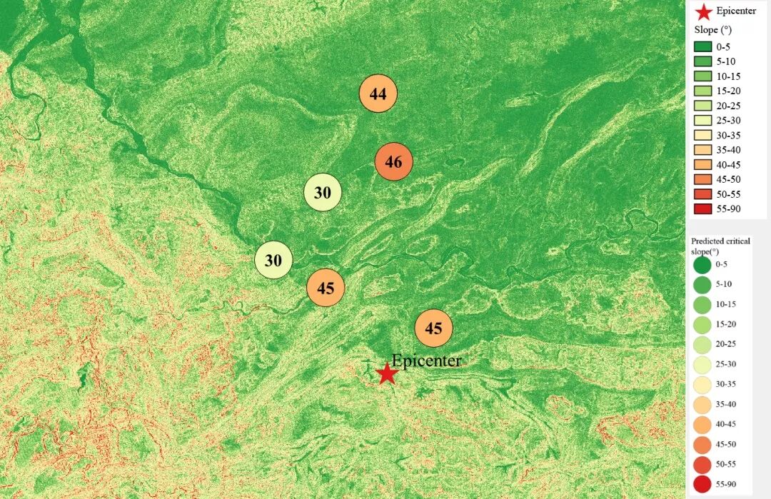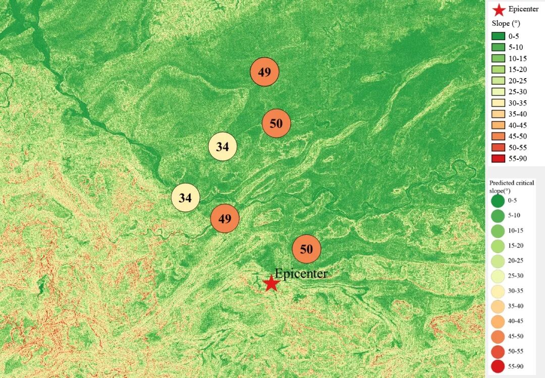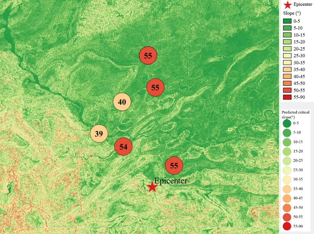 根据当地地形数据、岩性数据和实测地面运动记录,可以计算得到不同滑坡体饱和比例下的滑坡分布,如图6所示。其中,底图为当地坡度分布图,每个圆圈代表每个台站的计算结果,圆圈中的数字代表发生滑坡的临界坡度,台站附近坡度大于该数值的地方滑坡发生概率高。