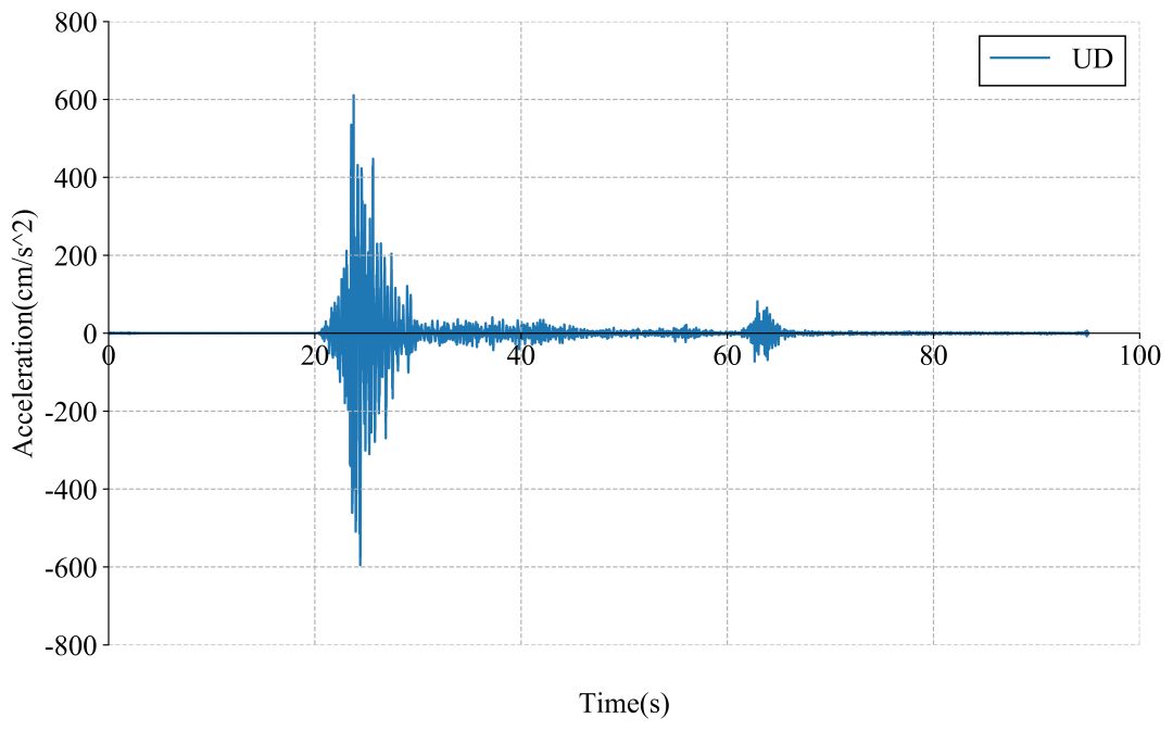 51GXT记录台站位置北纬28.43度,东经104.70度(图1,其中红色五角星为震中位置),记录到地震动峰值加速度为599.2cm/s/s。该地震动如图2、图3所示。