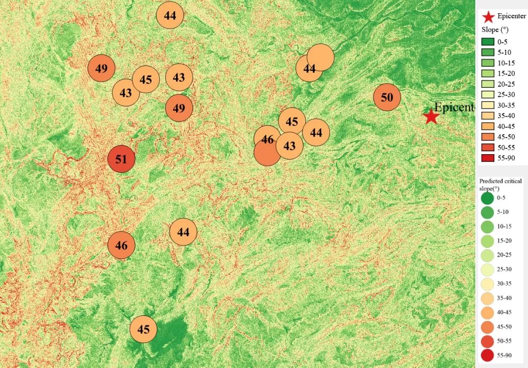 根据当地地形数据、岩性数据和实测地面运动记录,可以计算得到不同滑坡体饱和比例下的滑坡分布,如图12所示。其中,底图为当地坡度分布图,每个圆圈代表每个台站的计算结果,圆圈中的数字代表发生滑坡的临界坡度,台站附近坡度大于该数值的地方滑坡发生概率高。