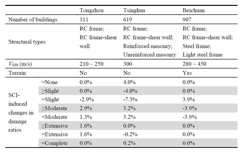 研究结果表明,对于区域尺度的建筑损伤比例指标,SCI效应的影响十分有限。尤其在建筑种类丰富、布局不规则的区域,建筑损伤比例的变化一般不超过8%,在实际时间与计算资源受限的情况下,可以采用不考虑SCI效应的分析结果。