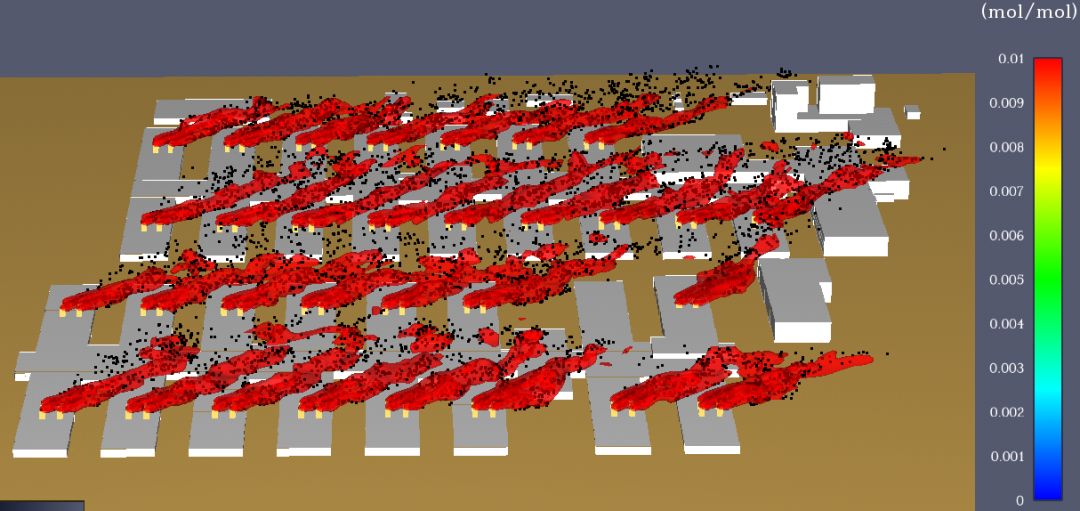 最后,为了定量获取指定位置的有害气体浓度,可以采用FDS的“&DEVC”指令,创建有害气体监测点。具体参数包括:(1) 用“QUANTITY”参数,指定监测内容为示踪气体的比例。(2) 用“XYZ=”命令,指定监测点在模型中的坐标。另外,也可以通过剖面、等值面等方式获取有害气体在空间的宏观分布。