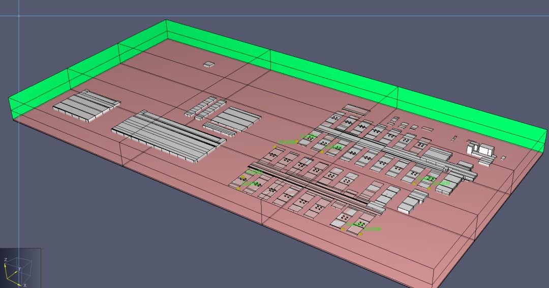 FDS中流场模拟和污染扩散分析需要输入以下信息:(1) 流场计算域网格;(2) 建筑物模型;(3) 风环境模型;(4) 排气口模型;(5) 有害气体监测点。具体介绍如下: