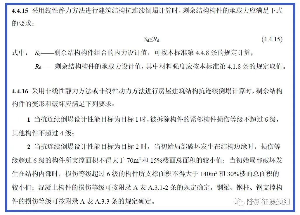 此外,还补充了混凝土结构和钢结构的设计规定,填充墙和楼板对倒塌抗力计算的贡献、抗倒塌结构构造措施;新增了组合结构、空间结构的设计建议。