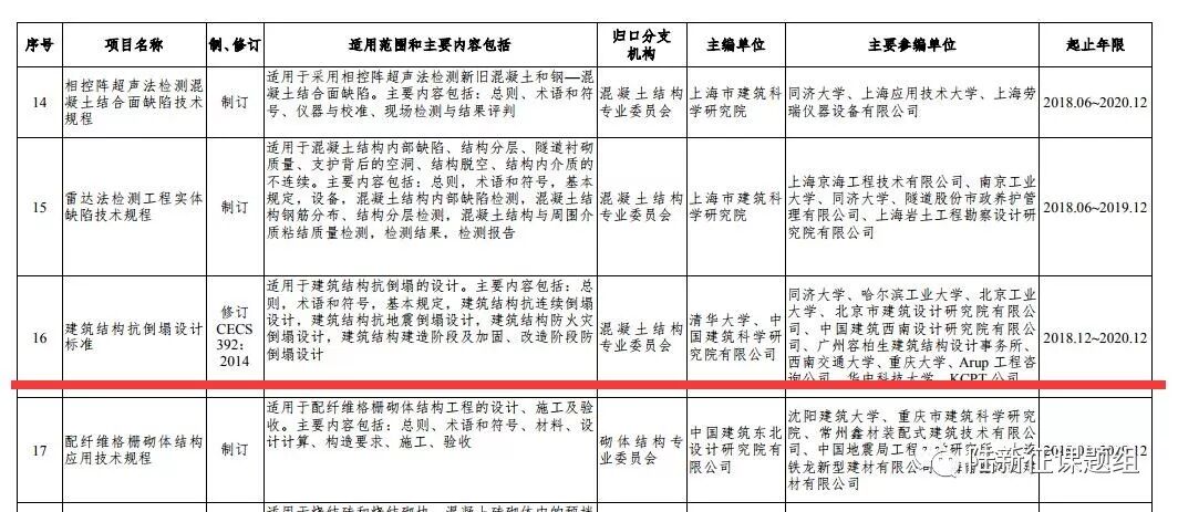 中国工程建设标准化协会近日批准了《建筑结构抗倒塌设计规范CECS392》的修订工作,起止年限为2018.12-2020.12。