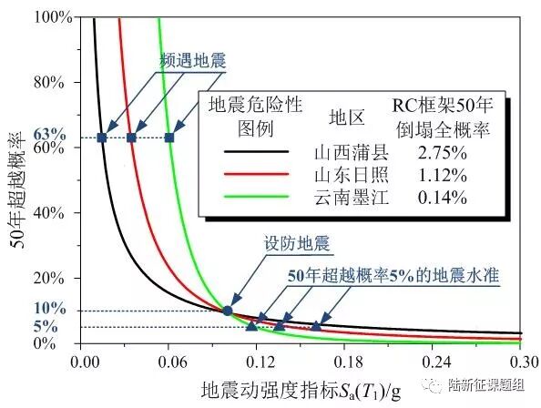 一张图是我们将一个按照规范7度设防设计的框架设定在全国不同地区,考察其50年设计期内的倒塌风险。结果发现其倒塌风险有着巨大的差别。造成这个结果的原因是:我国地震区划图目前还是按照50年超越概率10%的地震风险来设定的。而由于地震的复杂性,不同地区其50年超越概率10%的地震风险可能是一样的,但是50年超越概率2%的地震可能就会有巨大的差别。这样一来,某些地区建筑物的地震倒塌风险就可能会更高,这肯定是不合理的。