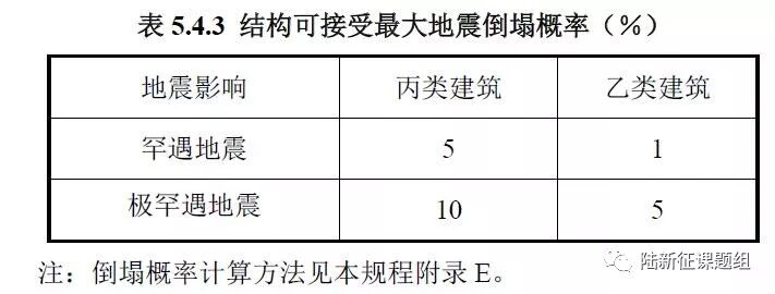 虽然我国规范规定了“大震不倒”的要求。但是考虑到地震和结构的复杂性,结构地震倒塌的风险是客观存在的,只是一个概率大小的问题。美国在2010年版本的ASCE-7规范中,率先提出了“面向一致倒塌率”的设计理念,要求对于常规结构,50年设计期内发生倒塌的概率不得大于1%。在2013、2016版的ASCE-7规范中,对上述要求做了进一步的完善,对不同重要性等级的结构,规定了从0.5%、1%、2.5%的50年可接受倒塌率(大致对应我国的乙类、丙类、丁类设防等级)。而我国目前缺乏相应的规定。
