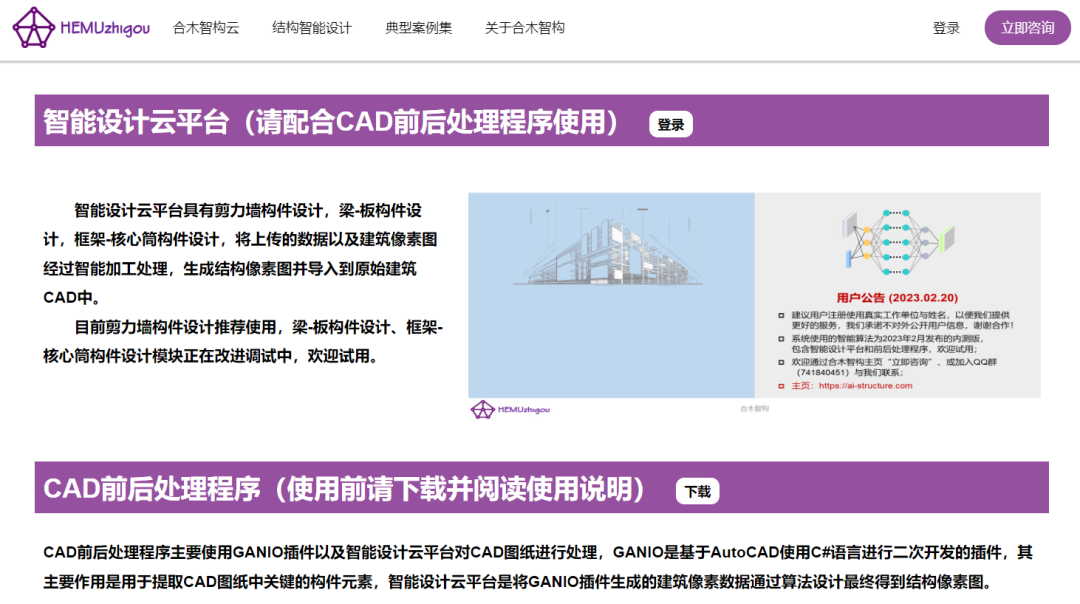 https://ai-structure.com为建筑结构生成式智能设计系统,现阶段可以根据建筑平面设计图,自动完成剪力墙结构的生成式智能设计(包括剪力墙的布置、梁的布置等)。StructGAN-v0.0.3的内测版已于2023年2月底上线。