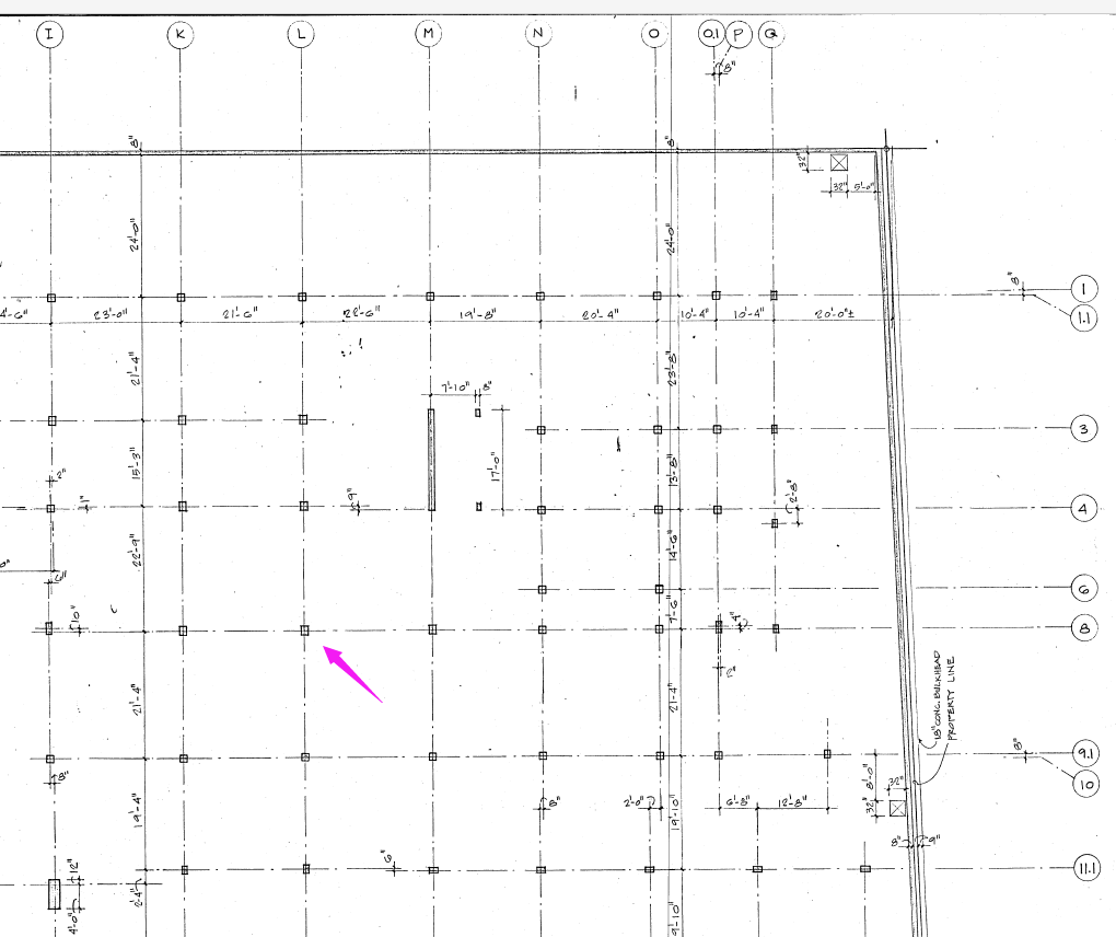计算分析时选取轴线8与轴线L交点对应节点(见图1)。图2给出了楼层平面布置。混凝土28天圆柱体强度标准值为3000 psi(21 MPa),板厚为8英寸(203.2 mm),板底钢筋为 #4(0.5英寸, 12.7 mm)。柱截面尺寸为14×18英寸(355.6×457.2 mm),保护层厚度取3/4英寸(19.05 mm)。