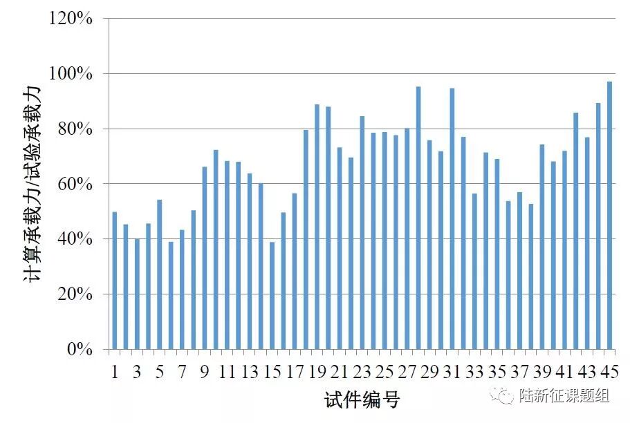 于是我们从各种文献中收集了45个图1所示的试验,然后按照上面的公式做计算。结果发现,算出来的承载力比试验承载力普遍要低30%(图2)!