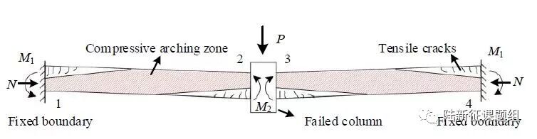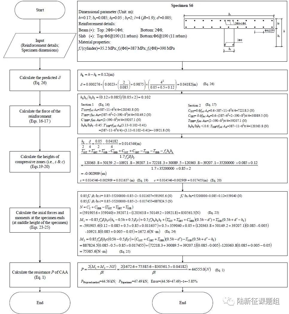 2. Park提出的方法中,并未考虑梁上楼板对压拱效应的贡献。实际上由于楼板的存在,梁内部的应力会更加的复杂,主要是某些截面由于楼板钢筋的贡献,会出现超筋破坏。另一些截面则会由于楼板作为受压翼缘,导致受压侧钢筋也达不到屈服应力。这样就会给截面内力计算带来很多的麻烦。针对上述需求,本文也建议了考虑楼板贡献的压拱效应计算方法,并给出了详细的计算流程(图6)。