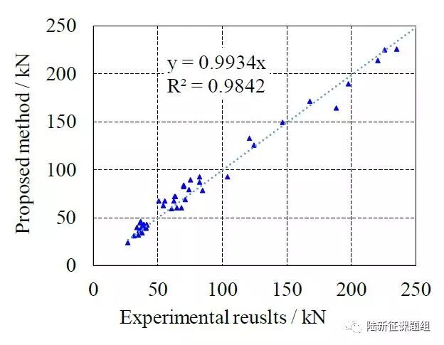 式中,l是梁的跨度,h是梁的高度。这个公式非常简便,而且最终预测的梁的承载力精度和大量试验结果对比也很好(图5)。