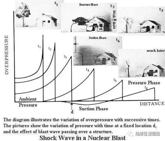 对工程结构而言,破坏作用最强烈的杀伤效应是冲击波。前几天台风“天鸽”的巨大威力大家都在新闻上看到了,“天鸽”最大的风速达到了185km/h,折合风压大约是1.6kN/m2。而防护工程需要抵抗的冲击波压力,可以达到“天鸽”的数百甚至数千倍。所以常规地上工程结构一般都无法抵抗这样巨大的冲击波(参见图5动画)。因此,人防工程主要采用地下工程的形式来抵抗冲击波的巨大破坏作用。