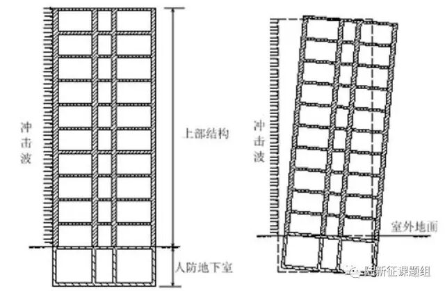 经过全国专家数十年的艰苦研究,我国在人防工程设计上取得了很多重要成果。但是随着我国城市和工程建设的发展,人防工程仍然有很多新的问题值得进一步去研究。我刚刚入职清华工作时,陈肇元院士和宋二祥教授曾经指导我们做过一个很有意思的课题:我国很多人防工程是建在建筑的地下室里面的。人防工程主要考虑从空气和土体中传来的冲击作用(图10)。但是随着我国城市的发展,高层建筑越来越多,在冲击波作用下,人防地下室可能会因为上部结构的倾覆作用而破坏(图11)。这个倾覆作用在我们人防工程设计时考虑不够。