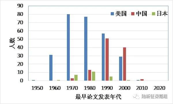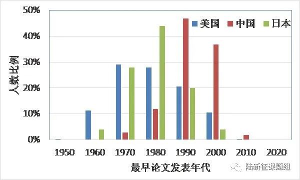 图1 中美日上榜学者最早(year of first publication)论文发表年代人数比例