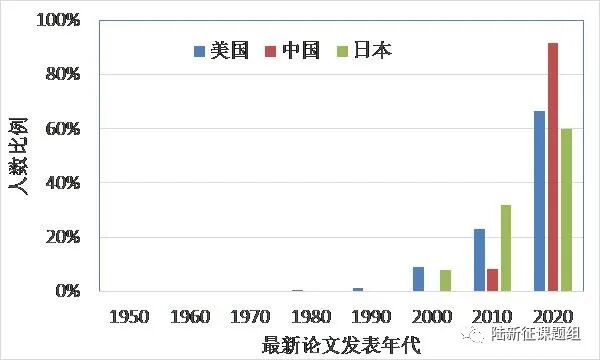 图3 中美日上榜学者最新(year of most recent publication)论文发表年代人数比例