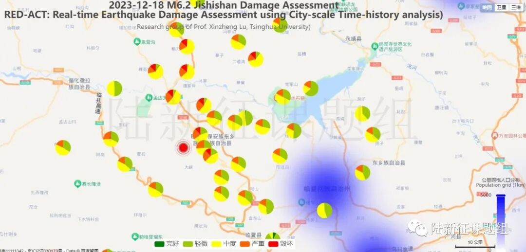 第一:虽然本次甘肃积石山地震的震级只有6.2级,明显小于2013芦山7.0级、2014鲁甸6.5级、2022泸定6.8级,但是测得的地面运动强度却非常突出。因此,本次地震导致严重的建筑破坏进而导致严重人员伤亡,也并不意外。第二:从图中不难看出,这几次地震均出现地面运动强度显著超过中国国家设计规范最高标准(9度罕遇)的水平,甚至鲁甸、泸定、积石山地震都远远超过了9度罕遇的设计反应谱。由第一个现象很容易得到以下结论:一次地震引起的地面运动强度大小,和地震震级有关但是关系非常复杂。仅仅通过震级来判断震害水平显然是偏于粗糙的。而现阶段的烈度评估方法,大多也是根据烈度和震级的关系来做评估(比如认为震中附近烈度大概等于震级+2),这样也没法很好的估计地震的震害水平。因此我们一再提出:既然现在已经可以密集布置传感器,并通过网络传输设备在震后实时得到传感器的记录(例如本次积石山地震中国地震台网中心就很快拿到了震中附近上千组地面运动记录),我们直接把完整的地面运动记录输入到工程对象的力学模型中,通过动力学计算其震害程度(即地震破坏力分析,详见链接:新标准发布 :基于强震动记录的地震破坏力评估)。只要地震记录的仪器和传输网络可靠,工程对象的数据合理,那评估出的震损精度理应高于通过震级、烈度等方法评估的结果。例如本次地震发生后,我们19日夜1点多完成分析,被问及估计这次地震损失如何时,我看着图中一片大大小小的橙色(建筑严重破坏)、红色(建筑毁坏)的结果,心情沉重的说:“很不好!很不好!”。