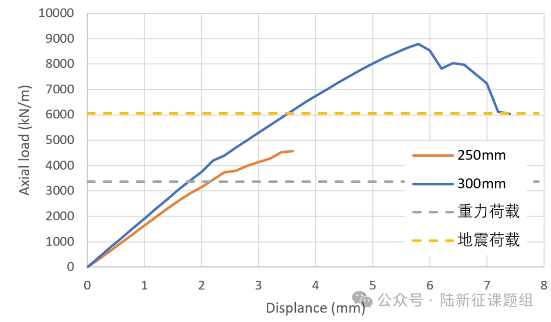 如果根据时程分析结果,建立单片墙肢(高5m,纵筋22D16)的非线性有限元模型。墙肢采用分层壳模型,并将时程分析的弯矩施加在墙肢的顶部,而后在墙肢顶部施加竖向荷载直至其破坏,得到其轴力-位移关系如下图所示。可见当墙厚为250mm时,其极限承载力在4000-5000kN/m之间,高于重力荷载的最大轴力,但是低于地震荷载下的最大轴力。