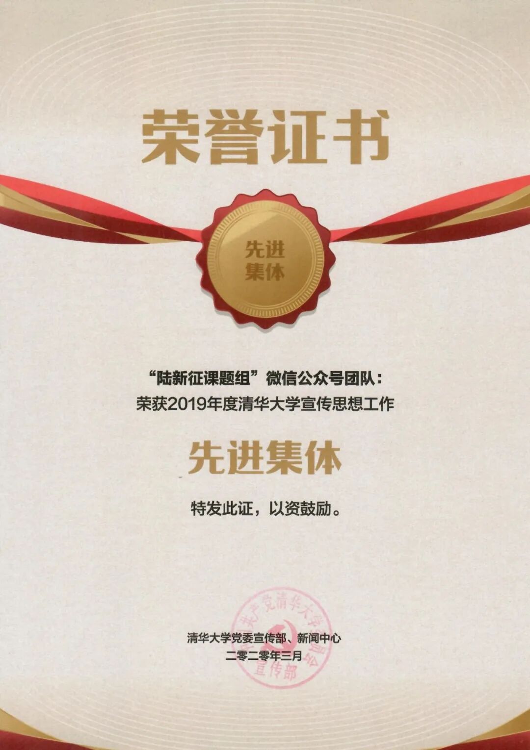 在课题组成员的共同努力下,课题组公众号先后获得“2019年度清华大学宣传思想工作先进集体”和环球科学杂志社评选的“2020学术公众号100强(科研团队公众号20强)”称号。
