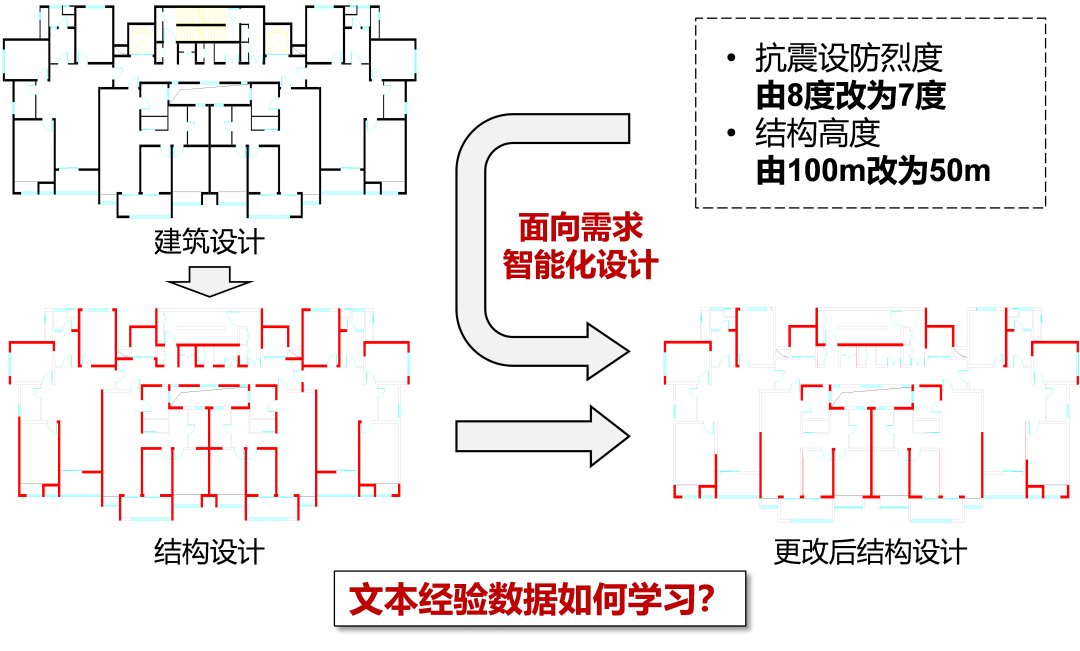 但是,结构设计还面临需要满足工程师提出的设计条件需求,比如我们希望一个8度100m的结构设计,更改为7度50m高度的结构设计,目前尚难以实现(图2)。而这种需求通常是以文本标签的形式存在,与建筑设计图数据异构,如何能让文本-图像共同指导AI生成对应的结构设计图,这便是本研究需要解决的关键难题。