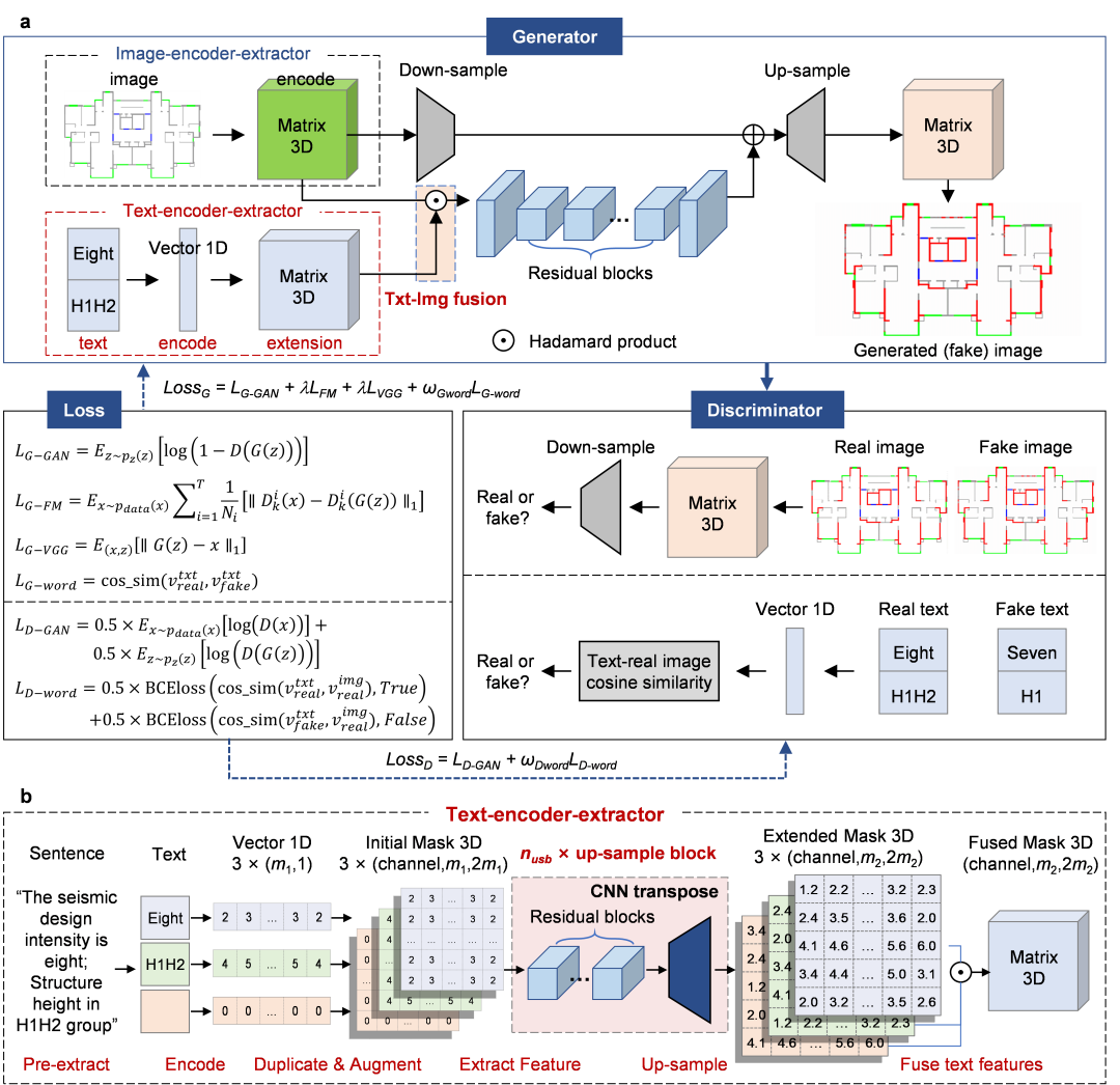 本研究的核心工作便是提出“文本-图像特征融合”生成对抗网络(图3),包括两个关键点:1)文本编码-特征提取模块(图3b);2)文本-图像特征的等尺寸融合,采用Hadamard product(图3a)。其余模块则主要沿用StructGAN中采用的pix2pixHD算法。虽然图3显得很复杂,但实际的操作并不复杂,详见开源代码。
