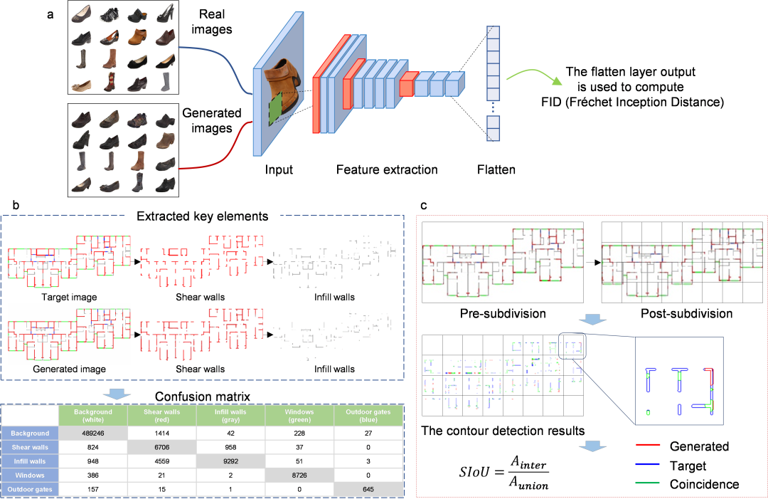 经过数据集的训练,需要对网络模型性能进行测试与评价,本研究采用了两种评价方法,一种是基于图像高维特征分布一致性的评价方法(图5a所示,适用于几乎所有图像),一种是基于像素和构件轮廓一致性的评价方法(图5b、5c所示,面向建筑结构设计)。
