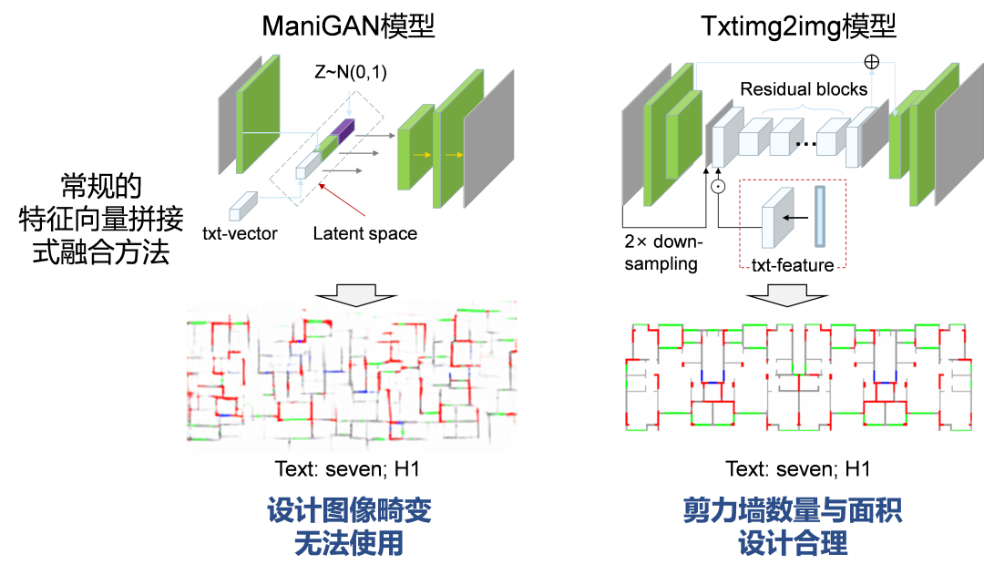 我们将本方法提出的等尺寸张量加权特征融合方法,与计算机视觉相关研究中常用的张量拼接方法进行了对比(例如ManiGAN)。可以看到,ManiGAN在本研究中容易出现生成设计图畸变的情况,主要原因在于建筑结构智能设计是典型的专业领域小样本问题,通用智能算法难以直接在本研究中应用。而txtimg2img的特征融合方法则有效保证了设计生成的图像质量稳定性。