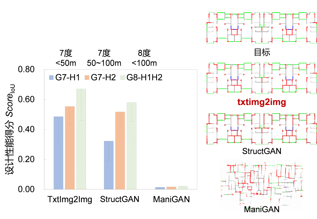 开展不同方法设计效果的对比,如图7所示。左边是多个案例测试的平均量化结果,右边则是典型的设计结果对比,表明txtimg2img具备较好的性能。