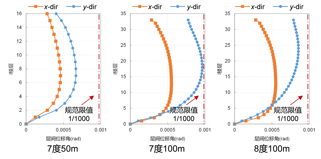 进一步,开展简单的结构力学性能分析,图9分析结果所示,不同的结构设计均能满足规范的层间位移角限定,且不过于保守。