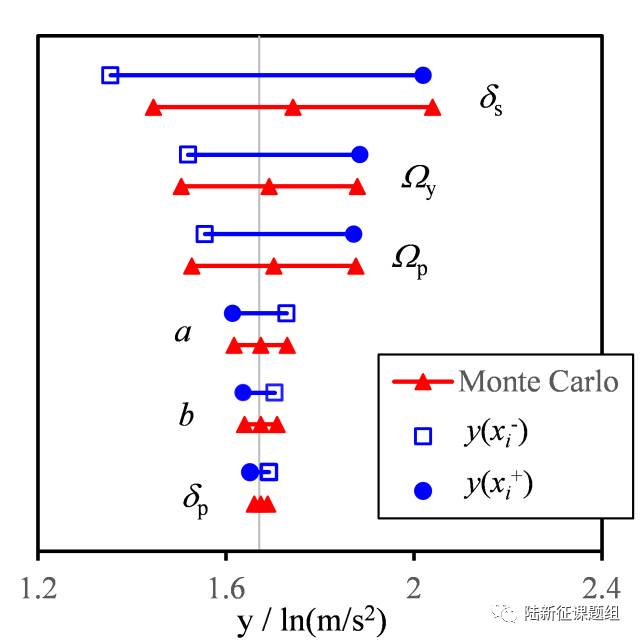 上图是一栋3层设防砌体在严重破坏状态下对应的参数敏感性分析结果。红线表示蒙特卡洛分析的结果,蓝线表示一次二阶矩方法的分析结果。