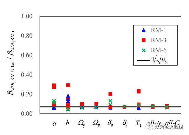 下图给出了区域分析与单体分析时,参数引起的易损性不确定性的比值。可以发现,当所考虑的建筑数量增多时,建筑的损伤率对于参数的敏感性将会大大降低,约为单体分析时的1/√n (n为建筑数量)。