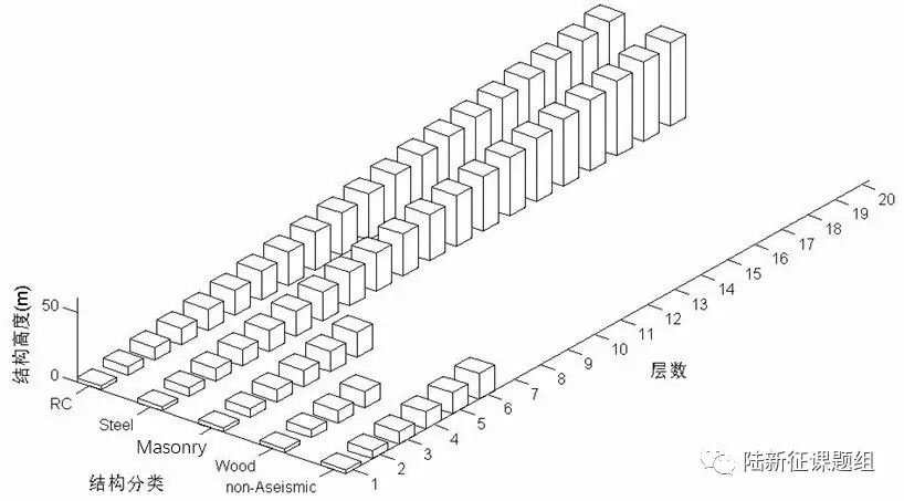 将图1地震动作用于图2中的各类建筑(针对九寨沟抗震设防8度情况,建立包括不同楼层数、不同结构类型和是否抗震等参数的建筑,其中,钢筋混凝土和钢结构1-20层,砌体房屋与非抗震房屋1-6层,木结构1-4层),产生的计算结果如图3。