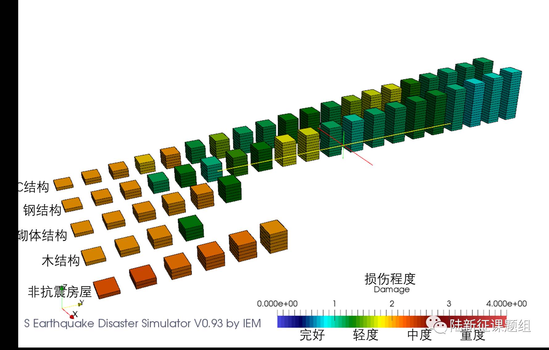 基于城市建筑群地震灾害仿真系统(S Earthquake Disaster Simulator V0.93,中国地震局工程力学研究所)的自动化建模、计算和可视化等功能模块,采用当地的设防烈度和设计要求,快速产生一系列包含不同结构类型、是否抗震和不同层数的结构弹塑性模型。通过输入应急期间的典型地震动,分析地震动对各种结构的破坏力。
