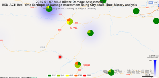 从图1已经可以看出,在拉孜和定结,都有相当数量的建筑达到了严重破坏(橙色)以上的程度。我们开展地震破坏力速报工作已经有7、8年了,每次看到这样的结果,一般都意味着灾情比较严重,类似的例如2022年四川泸定6.8级地震和2023年甘肃积石山6.2级地震(图3、图4)