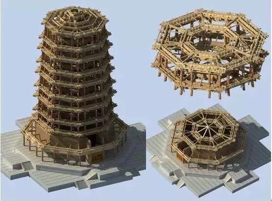 应县木塔结构整体与局部效果图(图片来源于相关修复团队修复时为研究结构而做的模型)