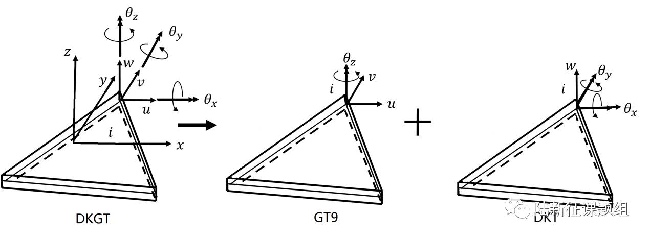 清华大学土木工程系研究生张书豪、田源等在之前工作的基础上,基于广义协调理论的三角形平面膜单元GT9以及三角形薄板弯曲单元DKT来构造新型三角形壳元DKGT。平面膜元GT9采用单元间协调条件,通过构造节点刚体转角,使其位移场具有更高阶次,提高了三角形单元的计算精度。同时使GT9的每个节点拥有三个自由度。DKT单元是基于Kirchhoff薄板弯曲理论构造,可以有效避免剪切闭锁的发生。