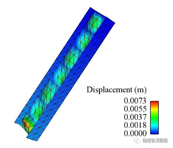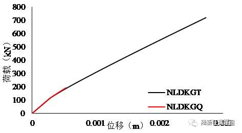 根据图5可知,四边形单元NLDKGQ的位移曲线在刚刚过了拐点就终止了,这是因为在NLKDGQ单元进行计算时,迭代次数超过了最大限制,即迭代不收敛,这可能是屈曲问题引起的四边形单元翘曲导致的。而NLDKGT单元则在拐点之后可以稳定的计算,说明三角形壳单元NLDKGT对翘曲问题有较好的改善。从图6可知,在NLDKGQ曲线终点时,两种单元计算得到的腹板变形形状相同,这证明了NLDKGT单元拥有较好的计算精度,同时三角形壳单元NLDKGT相比于四边形壳单元对屈曲问题有更好的适应性。