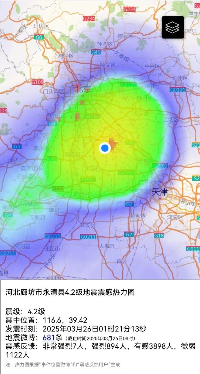 昨天凌晨(3月26日)在北京附近的廊坊市永清县发生4.2级地震,震源深度20km。虽然这次地震震级不大,深度也相对较深,但是影响范围却很大。中国地震台网速报在新浪微博上给出的微博用户实时反馈的震感热力图显示很大的一个区域都感受到了这次地震(图1)。